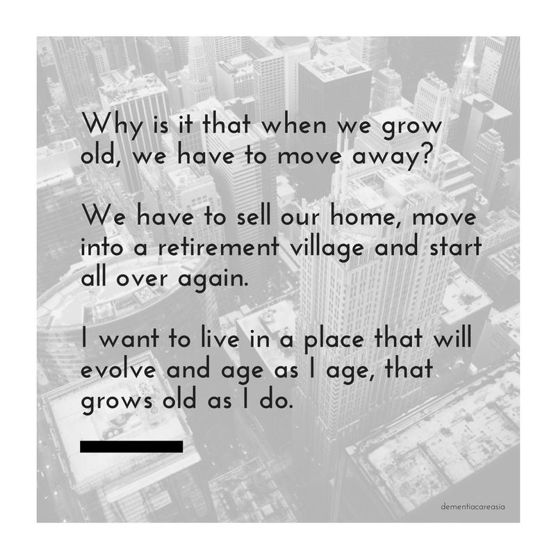 Why is it that when we grow old, we have to move away? We have to sell our home, move into a retirement village and start all over again. I want to live in a place that will evolve and age as I age, that grows old as I do.